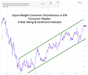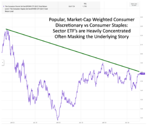 Most investors invest in sectors via ETF’s and funds. It’s important to compare the major ETF’s and market cap weighted strategies with equal-weighted strategies because sometimes, the most popular ETF does not tell the whole story in a sector. Monitoring the equal-weighted indices across discretionary & staples is vital to understanding the strength or weakness underlying the real economy. Remember, having this knowledge will help you across all the investments you hold given how reliant everything is to our economy.
