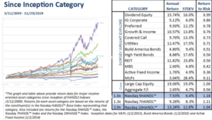 November proved to be a strong month for income-focused investments, with all sectors delivering positive returns despite market volatility. Leading the charge were MLPs, which surged 12.60%, benefiting from a favorable energy environment and rising commodity prices. This sector’s robust income generation continues to attract investors seeking yield in a stable energy backdrop. REITs followed far behind with a 3.54% return. While interest rates remain a challenge, strong demand for both commercial and residential properties kept the sector resilient. Similarly, Dividend Equities posted a strong 5.40%, benefiting from the broader market’s continued strength and providing investors with a balance of income and growth. Utilities delivered 3.78%, as their defensive nature remained appealing to investors seeking stability. With ongoing market uncertainty, the reliable income stream from utilities remains attractive. Growth & Income strategies also performed well, returning 5.84%, reflecting a mix of steady income and equity exposure. High Yield Bonds generated a modest 1.67%, as investor appetite for riskier assets remained cautious in the face of tighter credit spreads. Covered Calls posted 4.31%, as the strategy took advantage of solid equity performance while generating additional income through options.